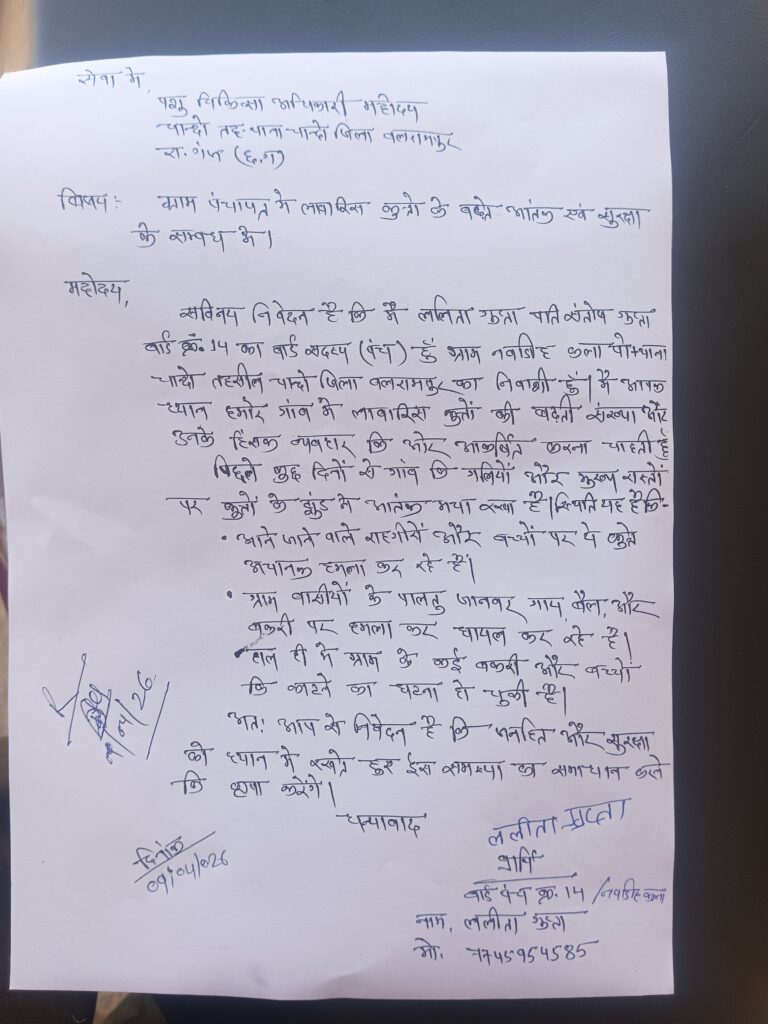 ग्रामीण इलाकों में लावारिस कुत्तों का आतंक थमने का नाम नहीं ले रहा है। ताजा मामला बलरामपुर जिले के चांदो तहसील अंतर्गत ग्राम पंचायत नवाडीह कला का है, जहाँ आवारा कुत्तों के झुंड ने ग्रामीणों का जीना मुहाल कर दिया है। स्थिति की गंभीरता को देखते हुए वार्ड क्रमांक 14 की सदस्य (पंच) ललिता गुप्ता ने पशु चिकित्सा अधिकारी को पत्र लिखकर तत्काल कार्रवाई की मांग की है।