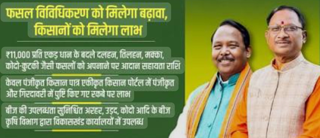 विधानसभा चुनाव 2023 में भारतीय जनता पार्टी का छत्तीसगढ़ में ऐतिहासिक जीत कांग्रेस का कुशासन अंत होते ही नया विष्णुदेव सरकार बनने के बाद जिस वादा के साथ भाजपा को छत्तीसगढ़ में जन समर्थन मिला। तत्काल किसानों के लिए कृषक उन्नति योजना के तहत धान की खरीदी 3100 रुपये प्रति क्विंटल की दर से की जाने लगी है, जिससे किसानों को अधिक लाभ पहुंचा रही है।