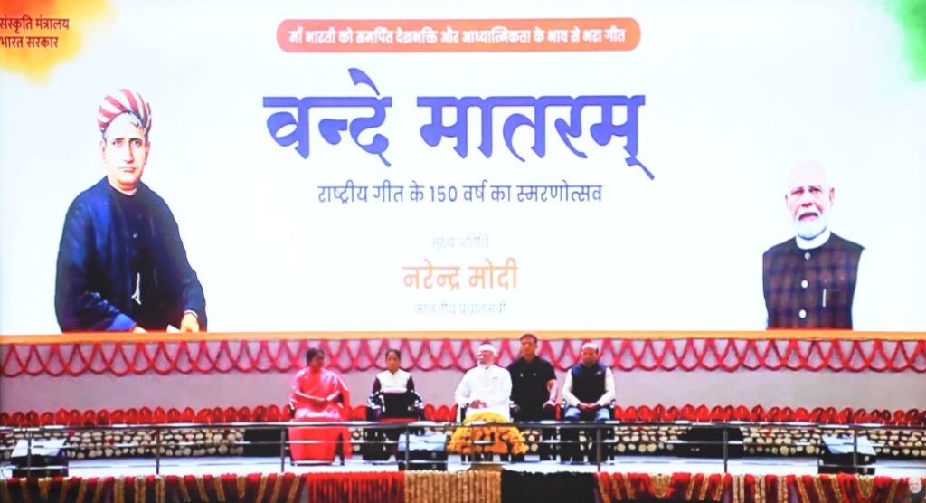 न्यूज़ दर्शन@बलरामपुर। राष्ट्रीय गीत वंदे मातरम् के 150 साल पूर्ण होने के अवसर प्रधानमंत्री श्री नरेन्द्र मोदी के नेतृत्व में पूरे देश में वंदे मातरम् स्मरणोत्सव कार्यक्रम का आयोजन किया गया। प्रधानमंत्री श्री नरेन्द्र मोदी राजधानी दिल्ली के इंदिरा गांधी इंडोर स्टेडियम में आयोजित कार्यक्रम में शामिल हुए। इस खास अवसर पर उन्होंने पूरे साल भल चलने वाले इस स्मरणोत्सव का शुभारंभ किया। इस दौरान प्रधानमंत्री श्री मोदी ने वंदे मातरम् डाक टिकट एवं 150 रुपये का स्मारक सिक्का भी जारी किया। साथ ही वंदे मातरम् पोर्टल को लांच किया। साथ ही सभी लोगों ने वंदे मातरम् गीत का गायन भी किया।