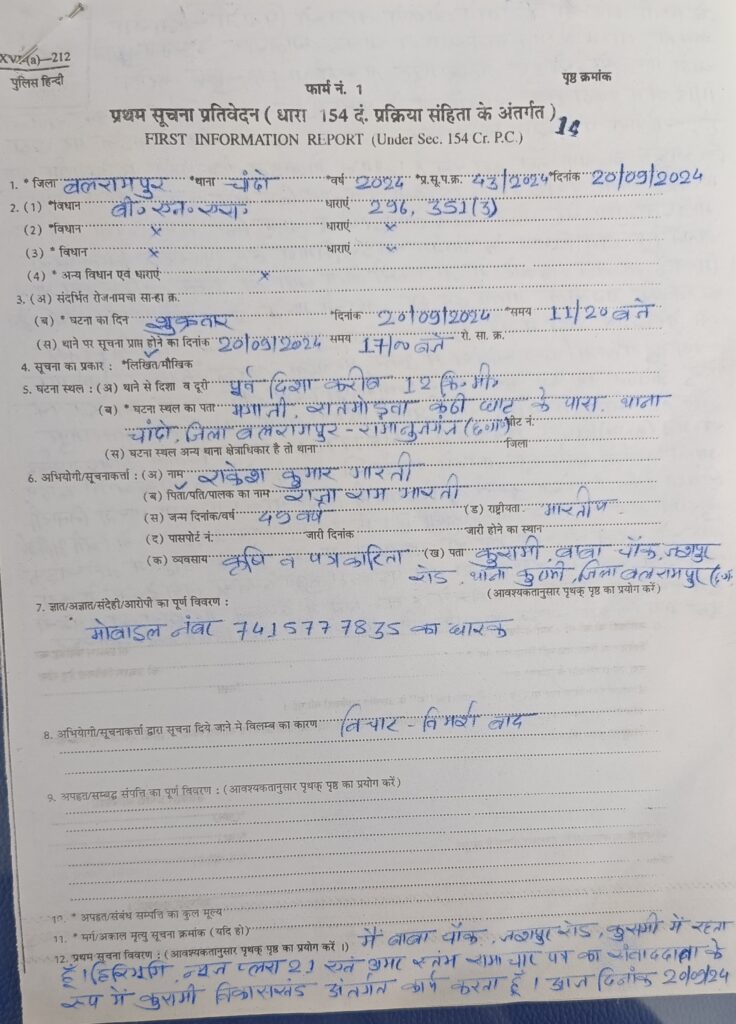 दूसरा कॉल करीब 5 मिनट बाद रिटर्न कॉल ठेकेदार के द्वारा राकेश भारती के पास आता है अश्लील गाली गौलोज करते हुए जान से मारने की धमकी कुसमी अपने निवास से उठा लेने की धमकी ठेकेदार के द्वारा राकेश भारती को दिया जाता है। यह पूरी घटना की जानकारी का ऑडियो रिकॉर्डिंग राकेश भारती के पास मौजूद है। घटना की जानकारी बलरामपुर पत्रकार कल्याण संघ के पदाधिकारी को दिया गया। संघ के पदाधिकारी के द्वारा बलरामपुर पुलिस अधीक्षक राजेश अग्रवाल को पत्रकार के साथ हुए अभद्र व्यवहार की जानकारी देते हुए कार्यवाही की मांग की है। यह मामला चांदो थाना क्षेत्र का है इसलिए राकेश भारती एवं अन्य साथी पत्रकारों के साथ जाकर ठेकेदार के खिलाफ चांदो थाने में मामला दर्ज कराया है। ठेकेदार के खिलाफ गाली गलौज एवं जान से मारने की धमकी देने के मामले में विभिन्न धाराओं में बी.एस.एस. धारा 296,351(3) में मामला दर्ज हो गया है। मौके पर राकेश भारती के साथ वरिष्ठ पत्रकार विकास मंडल पत्रकार संतोष गुप्ता मुशर्रफ अंसारी रवि शंकर गुप्ता अली खान थाने में मौजूद रहे।