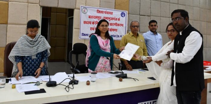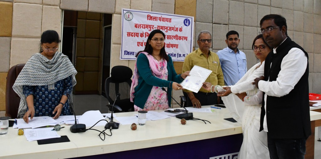 बलरामपुर। त्रिस्तरीय पंचायत चुनाव के तृतीय चरण में जनपद पंचायत रामचन्द्रपुर एवं वाड्रफनगर में 23 फरवरी को मतदान संपन्न हुआ। जिसके तहत जिला पंचायत सदस्य हेतु हुए मतदान के लिए आज संयुक्त जिला कार्यालय भवन के सभाकक्ष में जिला पंचायत सीईओ एवं रिटर्निंग अधिकारी श्रीमती नयनतारा सिंह तोमर की उपस्थिति में सारणीकरण एवं निर्वाचन परिणाम की घोषणा की गई। कलेक्टर एवं जिला निर्वाचन अधिकारी राजेन्द्र कटारा के निर्देशानुसार रिटर्निंग अधिकारी श्रीमती नयनतारा सिंह तोमर के द्वारा नवनिर्वाचित जिला पंचायत सदस्यों को प्रमाण पत्र प्रदान किया गया। तीसरे चरण में हुए जिला पंचायत सदस्य के मतगणना में जिला पंचायत क्षेत्र क्रमांक-01 से निर्वाचित सदस्य अनुसुइया वर्मा, क्षेत्र क्रमांक-2 से निर्वाचित सदस्य बेला कुशवाहा, क्षेत्र क्रमांक-03 से निर्वाचित सदस्य रामप्रताप सिंह, क्षेत्र क्रमांक-04 से निर्वाचित सदस्य साधना संतोष यादव, क्षेत्र क्रमांक-05 से निर्वाचित सदस्य मुन्शी राम तथा क्षेत्र क्रमांक-06 से निर्वाचित सदस्य बद्री यादव को रिटर्निंग अधिकारी द्वारा प्रमाण पत्र प्रदाय किया गया। इस अवसर पर रिटर्निंग अधिकारी श्रीमती तोमर ने सभी नवनिर्वाचित सदस्यों को शुभकामनाएं दी है।