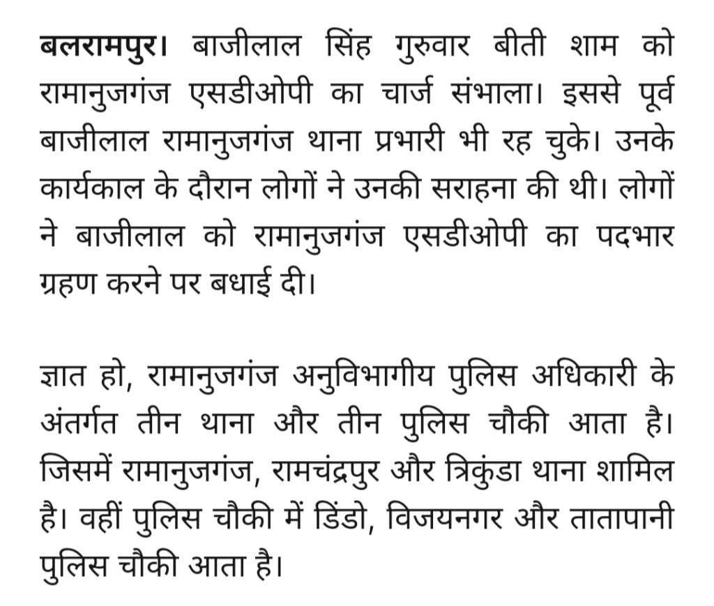 Homeबड़ी खबरेबलरामपुर-रामानुजगंज छत्तीसगढ़बलरामपुर बाजीलाल सिंह ने रामानुजगंज एसडीओपी का कार्यभार संभाला