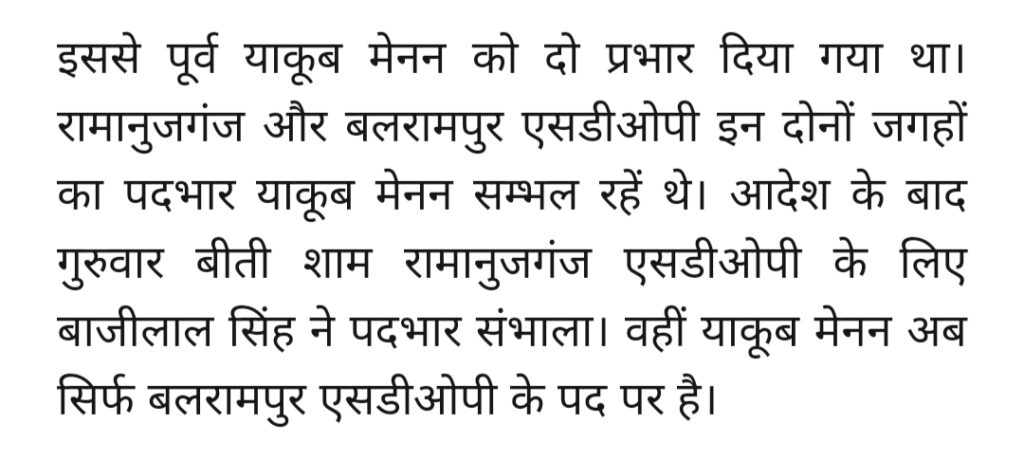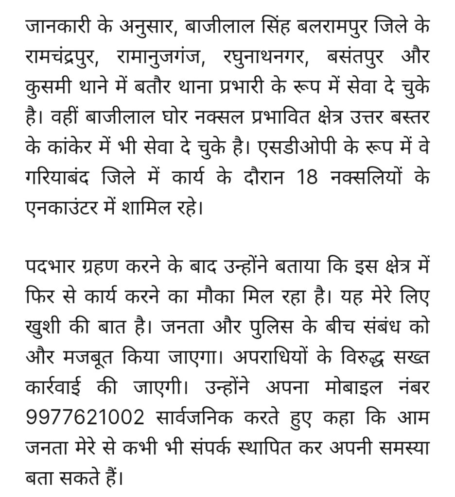 बलरामपुर बाजीलाल सिंह ने रामानुजगंज एसडीओपी का कार्यभार संभाला